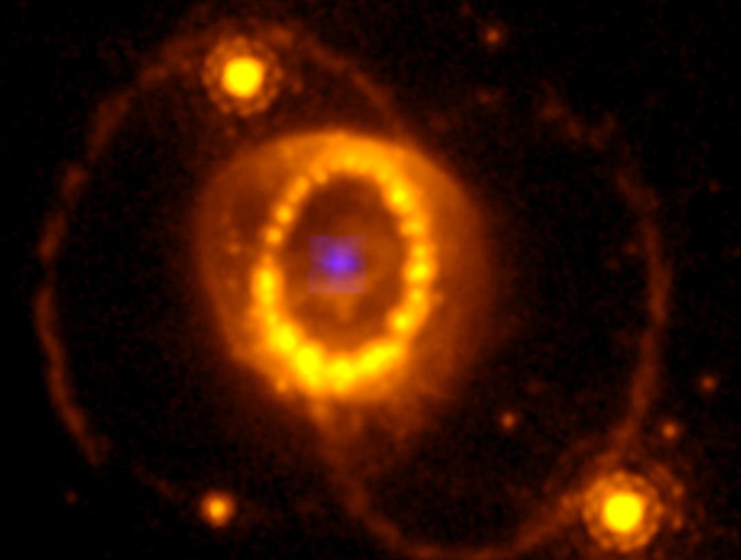 Combinação de uma imagem do Telescópio Espacial Hubble de SN 1987A e do Telescópio James-Webb mostrando uma fonte compacta de argônio azul claro no centro, detectada com o instrumento JWST/NIRSpec. © Telescópio Espacial Hubble WFPC-3, Telescópio Espacial James-Webb NIRSpec, J. Larsson