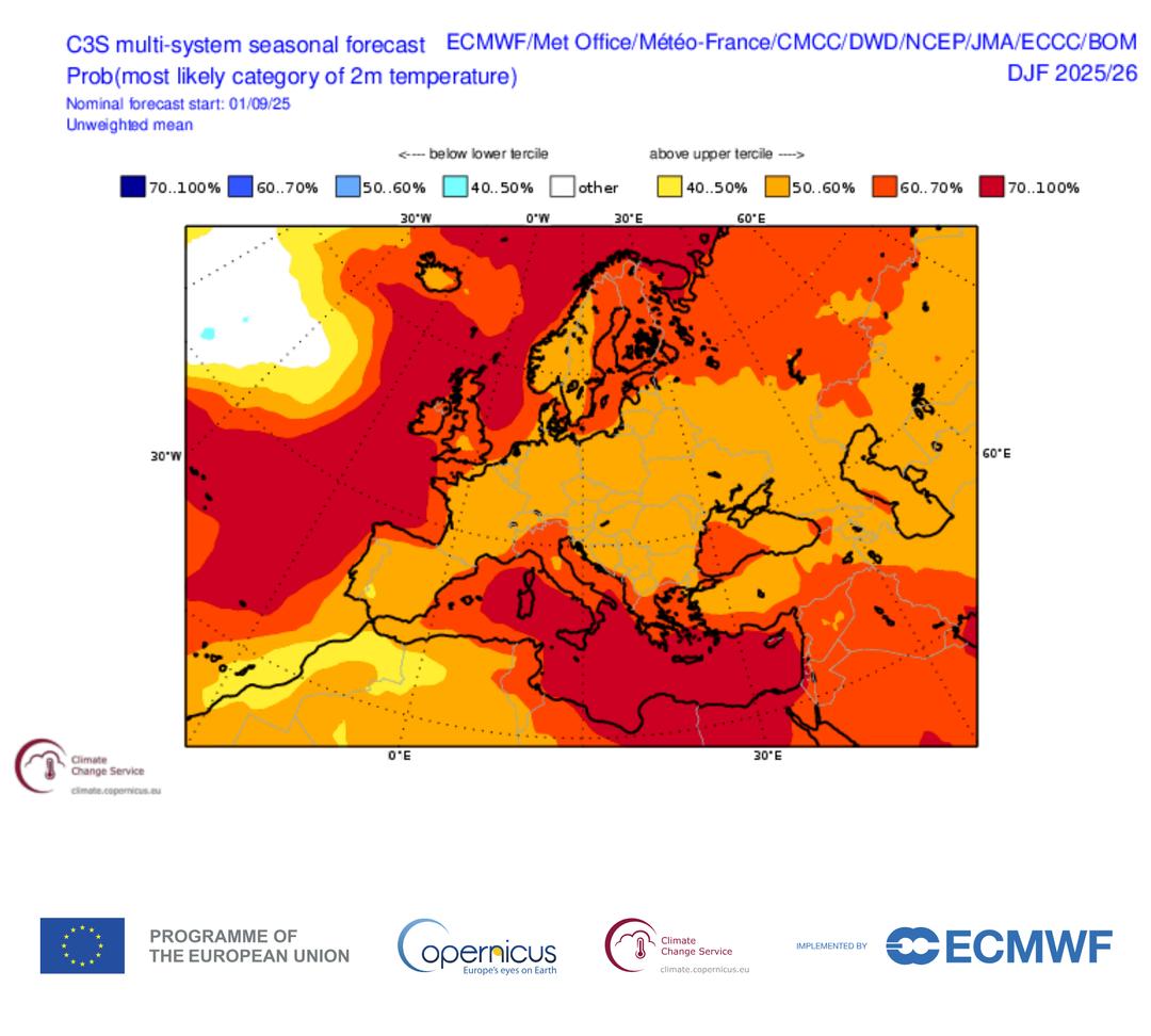 As previsões do organismo europeu são essencialmente as mesmas para a média dos três meses de dezembro-janeiro-fevereiro. Permanecem dúvidas sobre o precipitaçãoembora a maioria das organizações meteorológicas prevejam um inverno bastante seco, mas nenhuma prevê um inverno frio em 2025-2026.