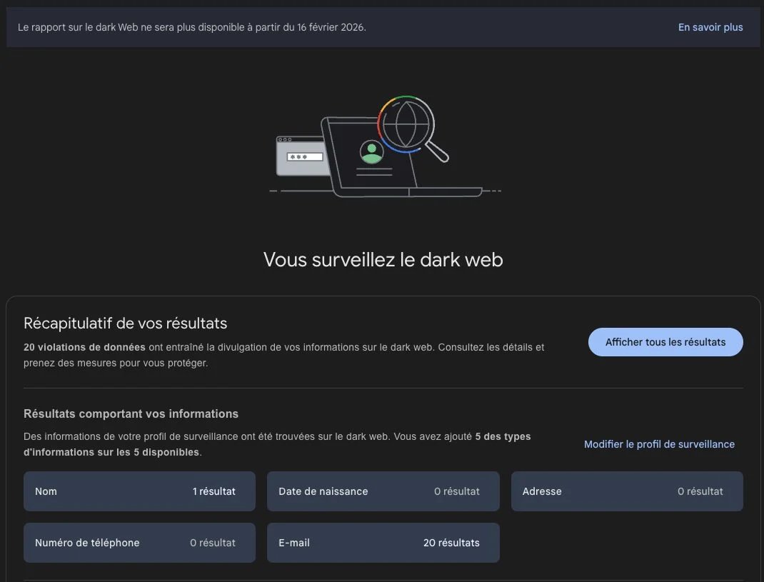 A segunda fase de desligamento do módulo começará dentro de alguns dias. Em 16 de fevereiro, “ o relatório da dark web não estará mais disponível » explica o Google em um banner exibido no topo da página em questão, bem como em uma página de suporte.