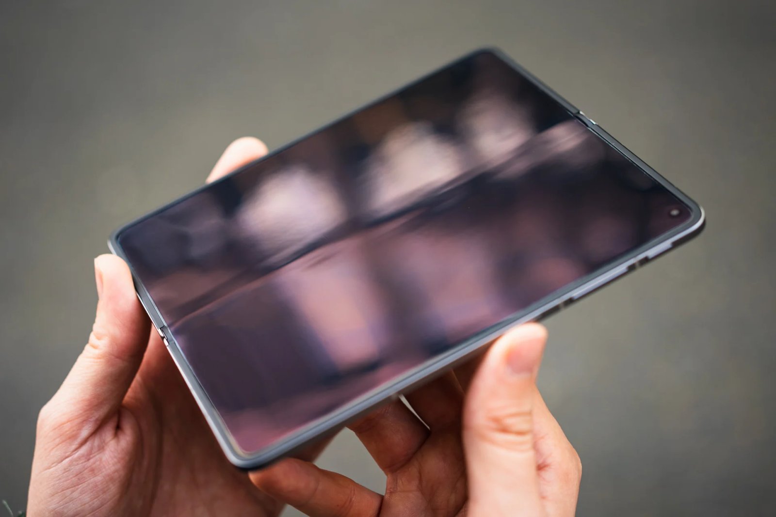 Vamos lá, se discutirmos e procurarmos um pouco o bichinho, um deslizar do dedo no meio da tela enquanto nos concentramos muito revela uma certa aspereza no local onde ele se dobra. Mas isso é tudo. De resto, estamos numa superfície plana. E isso não é nada.