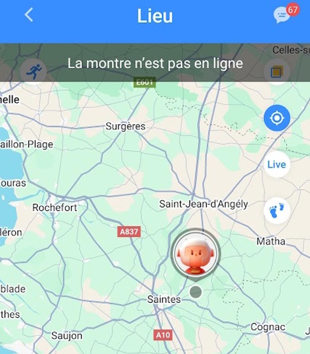 Mas o elemento obrigatório – o elemento mais tranquilizador deste relógio – continua a ser a sua geolocalização permanente. O GPS não é muito preciso, mas pelo menos sabemos aproximadamente onde está a criança, ou o relógio, caso ela o tenha perdido. Também é possível configurar um sistema de alerta com barreiras virtuais. Caso a criança saia da área predefinida, os pais recebem uma notificação.