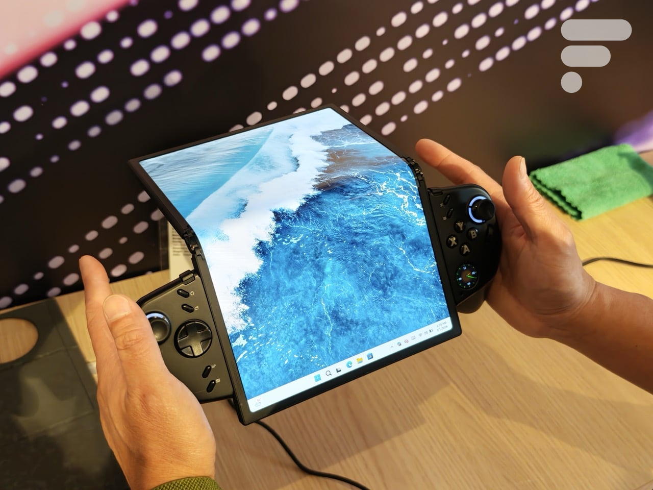 A tela é a estrela do produto: um painel POLED com definição de 2435 x 1712 pixels e uma taxa de atualização de 165Hz. A fidelidade colorimétrica está presente com 100% do espectro DCI-P3 e um brilho de 500 nits. É lindo, é fluido, mas esse também é o ponto chato. Uma tela dobrável em uma máquina de jogos significa expor-se a certas fragilidades. Conhecemos a relativa resistência destas telhas a riscos e poeira. Para um dispositivo que será manuseado de maneira brusca durante uma sessão de jogo, o risco é real.