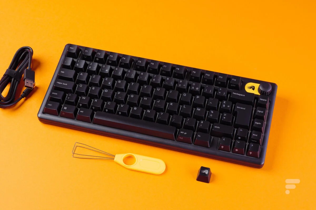 Glorioso trouxe um “ inovação » para este teclado… Isso está oculto sob as teclas. Embora seja um modelo de membrana, o teclas estão no formato MX, com uma haste transversal para prendê-los. Isto implica, portanto, que é possível substituí-los facilmente, como em (quase) qualquer teclado mecânico. Uma ferramenta de extração também é fornecida na caixa.