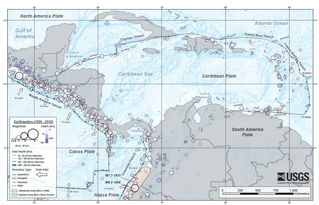 Na região, quatro grandes placas interagem com a placa caribenha: