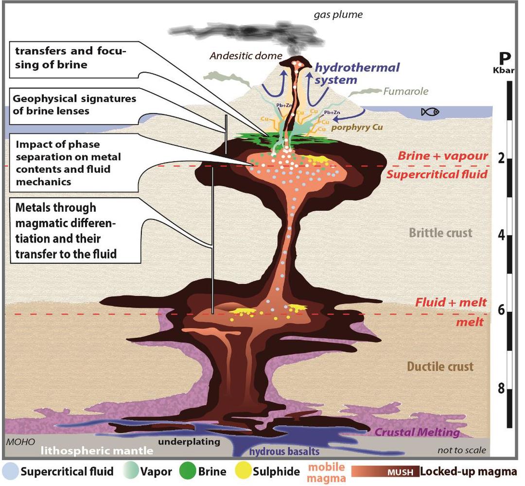 Estes metais poderiam, no entanto, ser exploráveis de outra forma em centros vulcânicos activos, extraindo-os directamente destes fluidos hidrotermais que circulam em profundidade e a que chamamos salmouras magmáticas.