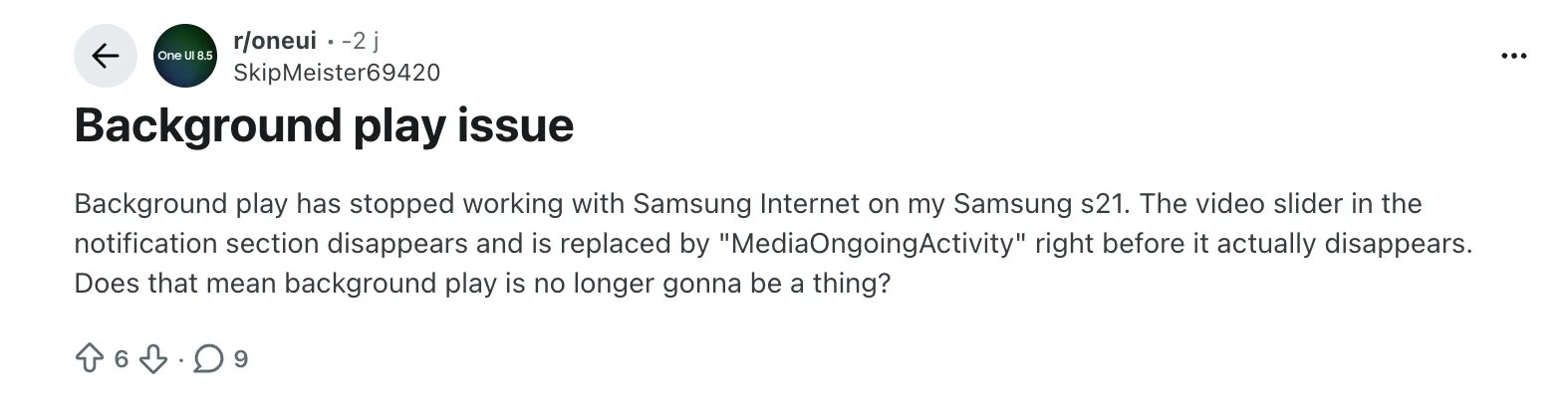 O problema, relatado inicialmente pelos internautas da Samsung, parece se estender a outros navegadores como Microsoft Edge e Vivaldi: assim que o usuário minimiza o navegador ou bloqueia o smartphone, o som é cortado instantaneamente. Alguns até notaram uma notificação dizendo “MediaOngoingActivity” aparecer pouco antes dos controles de reprodução desaparecerem completamente.