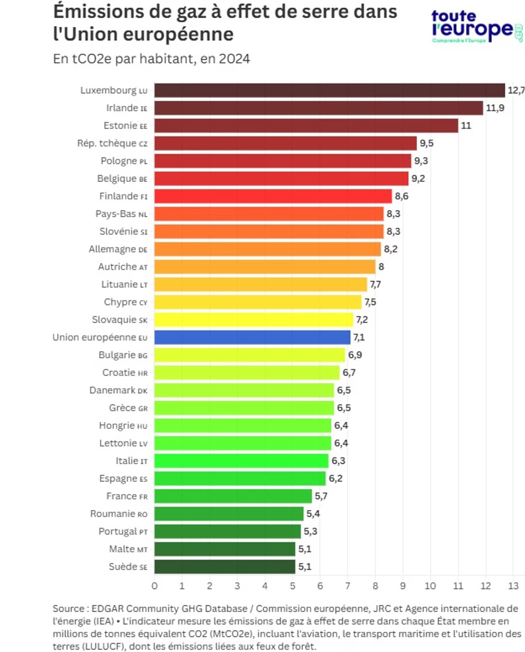 Emissões de gases com efeito de estufa na Europa, per capita. © touteleurope.eu