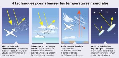 Outra abordagem: o brilho das nuvens marinhas. É inspirado na modificação das propriedades das nuvens marinhas baixas em contato com as emissões dos navios. Os aerossóis aumentam o número de gotículas nas nuvens, tornando-as mais reflexivas. Mas esta tecnologia é “menos maduro ” do que a injeção de aerossol, segundo Peter Irvine, professor assistente da Iniciativa de Engenharia de Sistemas Climáticos da Universidade de Chicago (Estados Unidos). Ainda mais especulativo: o brilho das nuvens cirros e o reflexo da luz do espaço.