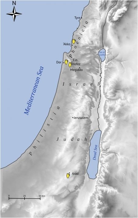 Locais dos tesouros de prata fenícios de Tel Dor, ʿAkko, ʿEin Hofez e ʿArad. Créditos: Yoav Borenstein/Shnyr et al., 2026