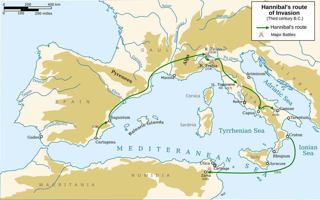 Chamado Aníbal, este excelente estratega conseguiu atravessar os Pirenéus, o Ródano e depois os Alpes e surpreender a grande Roma ao chegar pelo norte, conquistando várias vitórias importantes no solo onde hoje é a Itália. O cartaginês foi finalmente repelido pelo general Cipião Africano, antes de poder tomar a capital do Império Romano.