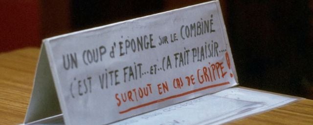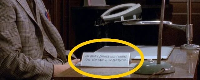 Nesta sequência, Pierre (Thierry Lhermitte) senta-se à sua mesa e conversa com Thérèse (Anémone). Sobre a mesa, mesmo ao lado do candeeiro, há uma pequena placa onde se podem ler claramente as seguintes palavras: “Uma limpeza rápida no telefone foi feita… e… é legal…”
