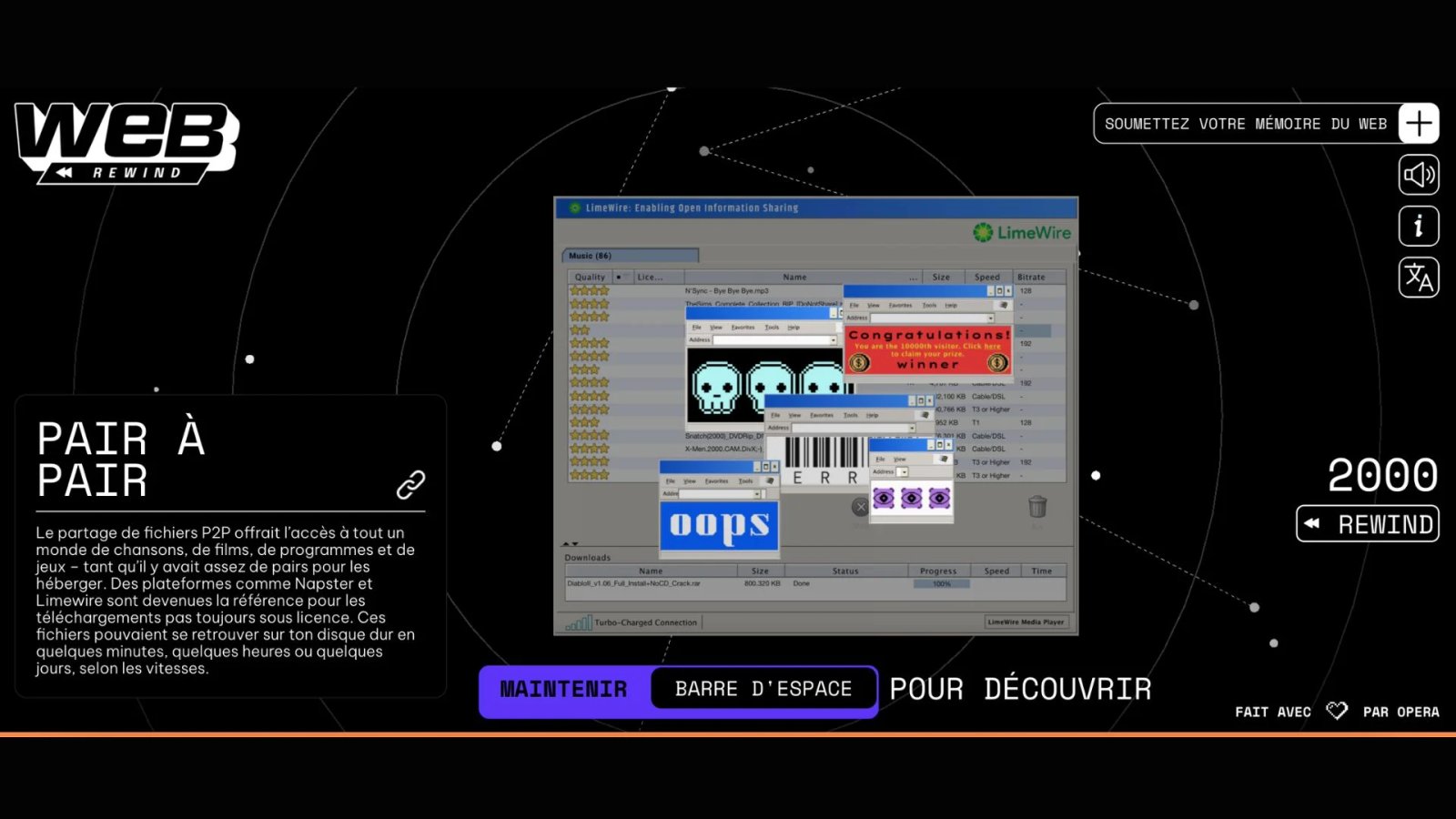 Graças ao Web Rewind, redescobrimos a Internet e lembramos porque a amamos tanto há décadas. O Opera teve a engenhosa ideia de torná-lo uma experiência real com efeitos sonoros, música e a sensação de retroceder com a barra de espaço para viajar de um ano para o outro. O navegador europeu não deixa de nos fornecer anedotas sobre cada acontecimento para melhorar a nossa cultura da Internet e reavivar as nossas memórias.