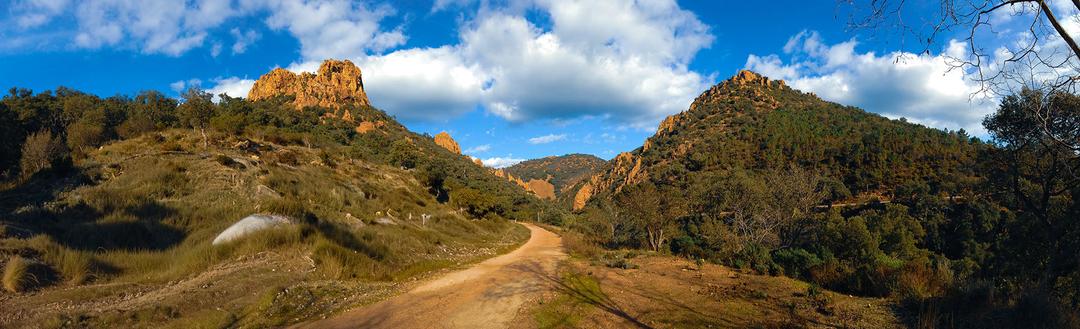 Rochas riolíticas vermelhas, vestígios vulcânicos com 250 milhões de anos, o Estérel incendeia o horizonte. Entre pinheiros de Aleppo e sobreiros, a natureza cria raízes na lava congelada. Aqui, a ciência fala do fogo e a poesia vê montanhas em chamas eternas © Agnès Bugin, todos os direitos reservados
