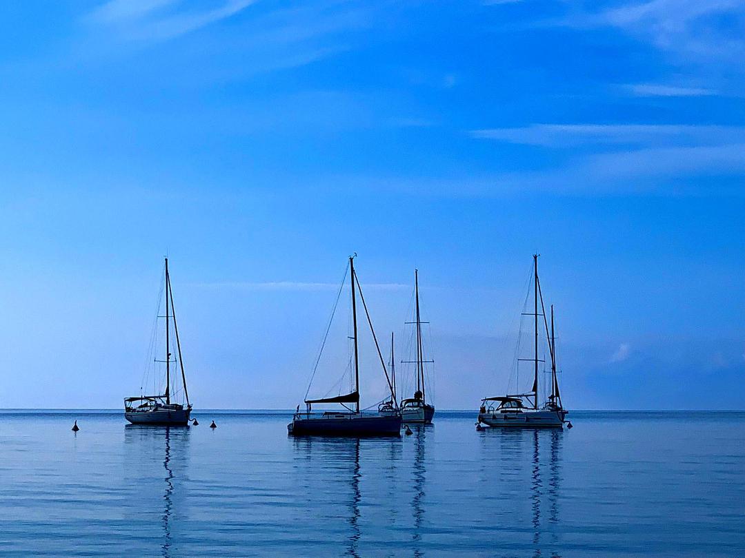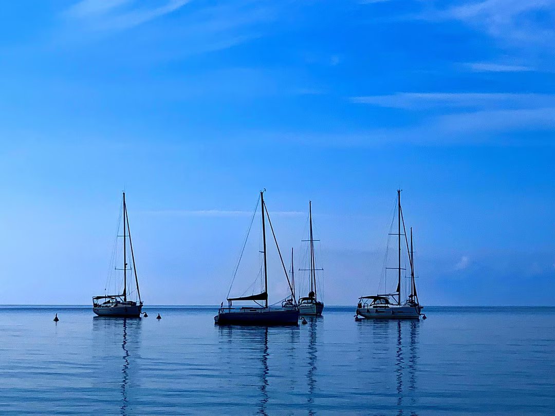 Ao largo da costa de Saint-Raphaël, o Mediterrâneo estende-se como seda luminosa. Quatro veleiros descansam em seu espelhofrágeis silhuetas brancas flutuando entre o céu e o mar. A luz tem essa pureza única da costa sul: transparente, vibrante, doura as velas e faz brilhar o horizonte.