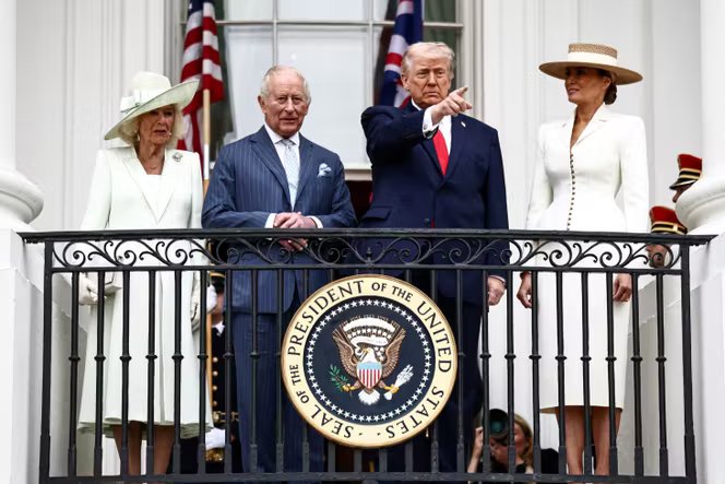 Na manhã de terça-feira, Carlos III e Camilla foram formalmente recebidos na Casa Branca por Donald e Melania Trump durante uma cerimônia militar. Vinte e um tiros de canhão foram disparados para sua chegada. “Que ótimo dia britânico”declarou o presidente norte-americano a partir de uma plataforma instalada no relvado sul da Casa Branca. “Desde que conquistamos a nossa independência, há muitos séculos, os americanos não tiveram amigos mais próximos do que os britânicos.”disse ele acrescentando que os dois países mantinham uma “relacionamento especial, e esperamos que seja sempre assim”.