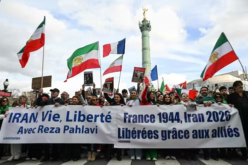 Manifestantes anti-regime iraniano brandem bandeiras iranianas decoradas com o leão e o sol, símbolos da revolução de 1979, em Paris, 1 de março de 2026.