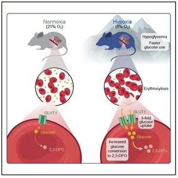 Mas o que acontece com a glicose uma vez absorvida pelos glóbulos vermelhos? Utilizando a rotulagem do açúcar, os biólogos mostraram que, em condições de baixa oxigenação, a glicose era convertida muito mais rapidamente em 2,3-DPG (2,3-difosfoglicerato), uma molécula que se liga à hemoglobina e a ajuda a libertar oxigénio para os tecidos. Em outras palavras, exatamente o que o corpo necessita em altitude.