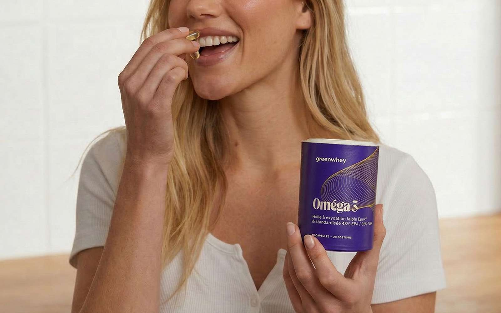 O ômega 3 marinho (EPA e DHA) é o mais diretamente utilizável pelo organismo. A sua concentração é um critério valioso para apoiar a sua escolha. Por exemplo, greenwhey oferece cápsulas altamente dosadas que permitem uma ingestão significativa de ácidos graxos: cada porção contém 2.580 mg de ômega 3, 1.440 mg de EPA e 960 mg de DHA.