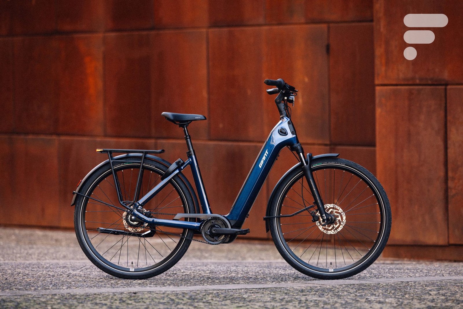 A principal distinção é uma moldura aberta semelhante ao AnyTour, que esconde completamente a bateria removível. Mais opulento, o VAE urbano segue os códigos do setor, com bagageiro traseiro refinado e iluminação frontal na haste. O Giant NewTour E+ mantém a posição de condução vertical e o resto do equipamento do dia a dia (guarda-lamas, descanso, bloqueio das rodas).