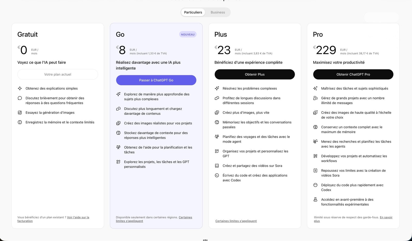 De um lado, um versão gratuita cada vez mais contido, que te interrompe após três perguntas complexas. Por outro lado, uma assinatura Mais por 24€ difícil de justificar se você não codifica em Python. A OpenAI finalmente preencheu esta lacuna na França com Bate-papoGPT Go.