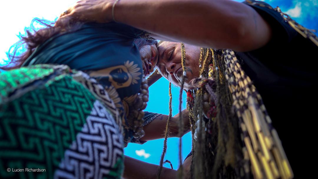 Hongi de vários minutos entre Whaia, Maori – NZ e uma mulher nativa americana da bacia amazônica. © Lucien Richardson, COP 30