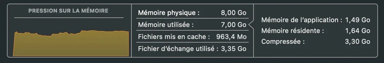 Atenciosamente, estou escrevendo estas linhas em um MacBook Air M2 com 8 GB de RAM. O desempenho do chip é superior ao do M1 (cerca de +18% em CPU e +35% em GPU), mas o verdadeiro gargalo está na RAM. Estou no lado intensivo dos usuários de “escritório”. Entenda com isso que não faço edição de vídeos e que meu nível de edição de fotos é muito limitado. Por outro lado, posso facilmente ter mais de 20 guias abertas ao mesmo tempo no meu navegador. Adicione a isto algumas aplicações de produtividade (Slack, Antidote, Notes, etc.) e a pressão na memória rapidamente se torna muito significativa, ao ponto de sofrer algumas lentidão.