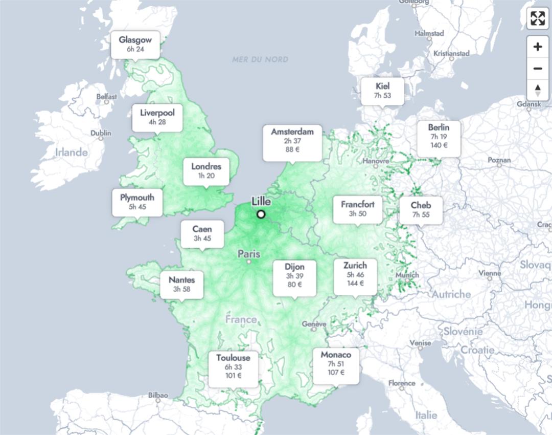 Esta ferramenta interativo criado em 2022 permite visualizar possíveis destinos até 8 horas de casa. Basta inserir a cidade de partida, duração da viagem máxima e um mapa isócrono é então exibido. Este conceito utilizado desde finais do século XIXe século, particularmente no planeamento urbano e na gestão dos transportes, permite-nos compreender melhor as realidades espaciais em função do tempo, em vez de pura distância.