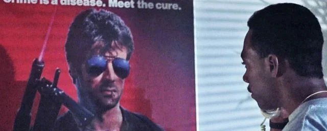 Durante uma cena em Beverly Hills Cop 2, onde Axel Foley (Eddie Murphy) está ao telefone, ele olha para o pôster de Cobra, um filme icônico de Sylvester Stallone lançado alguns anos antes. Mas porquê esta referência? Retrocesso.