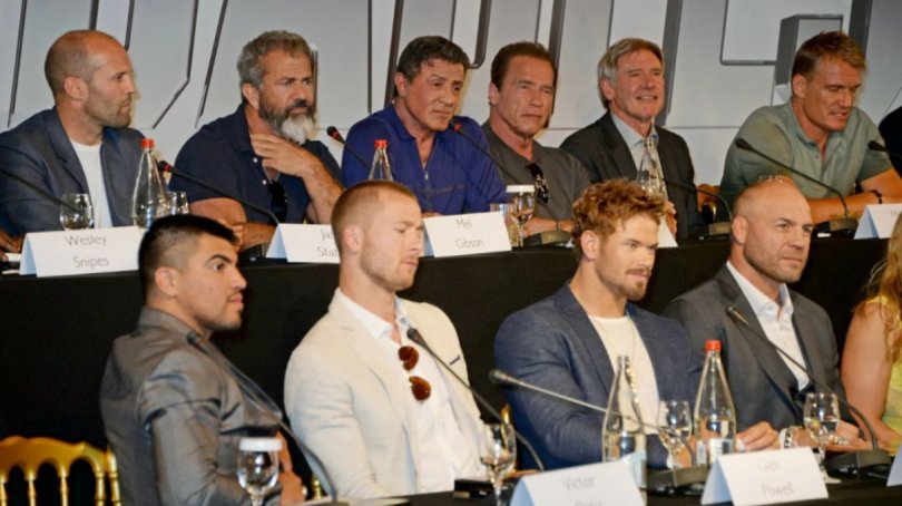 Desta vez, compareceram todos à conferência: Sylvester Stallone, Arnold Schwarzenegger, Harrison Ford, Mel Gibson, Dolph Lundgren, Wesley Snipes, Antonio Banderas, Randy Couture, além de Ronda Rousey (a única mulher do grupo), e os jovens (que não dizem uma palavra) Kellan Lutz, Victor Ortiz e Glen Powell. Além de Kelsey Grammer (Fraser) e do diretor Patrick Hughes em nome do humor.