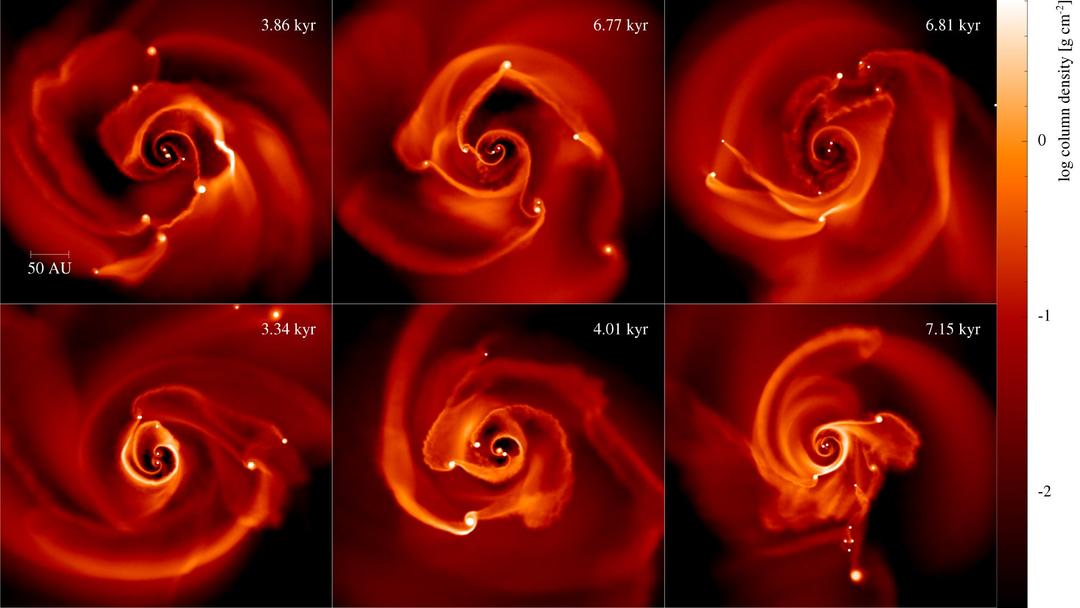 Estas simulações também mostram que estes discos produzem um grande número de protoplanetas frequentemente comparáveis a planetas gigantes. Esses objetos geralmente se formam longe do centro do sistema, a distâncias comparáveis a várias dezenas de vezes a distância entre a Terra e o planeta. Sol.