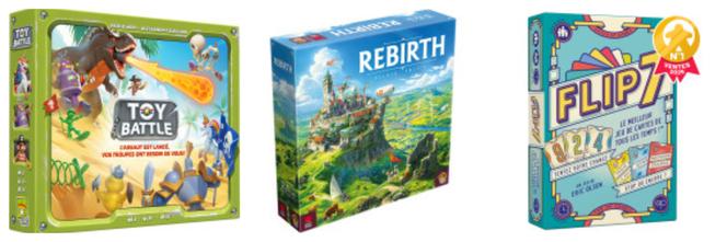 Toy battle (Repos Production, cerca de 23€) ganha assim o prémio na categoria rainha do Ás de Ouro; este jogo de conquista para dois jogadores tem beneficiado de um boca a boca muito favorável, nomeadamente pela riqueza e variedade das cartas que oferece. Supera uma das grandes revelações do ano, Flip 7 (Catch up games, cerca de 14€), um jogo simples e muito bem desenhado do tipo “stop or still” que conseguiu destronar Skyjo, estrela de vendas durante vários anos, em muitas lojas. O terceiro nomeado, Rebirth (Lucky Duck Games, cerca de 40€), é um jogo de colocação um pouco mais complexo mas muito adequado para famílias que gostam de um pouco de competição.