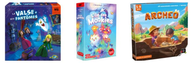 A ilha dos mookies (O Escorpião Mascarado, cerca de 11€, a partir dos 4 anos) ganha o prémio nesta categoria. Este jogo para dois jogadores – ainda hoje uma raridade em jogos destinados ao público jovem – é baseado numa mecânica de colecção (e também inclui cartas frustrarbrilhante). Ele está à frente Archéo (Gigamic, cerca de 25€, a partir dos 5 anos), um jogo em que é necessário usar uma pá de sucção para virar peças que escondem fósseis e reconstruir um esqueleto de dinossauro. Também está à frente de A Valsa dos Fantasmas (Schmidt Spiele, cerca de 40€, a partir dos 5 anos), um jogo cooperativo de exploração envolvendo lindos fantasmas, com um sistema muito inteligente (e que é um pouco assustador na medida certa) para movimentar os espectros.