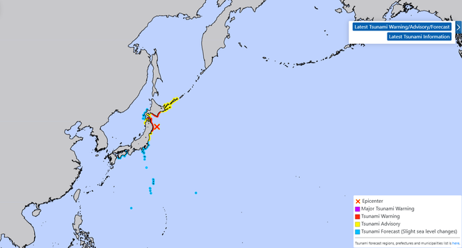 As primeiras ondas do tsunami poderão atingir imediatamente a costa norte, disse a JMA. Ela alertou que os danos causados pelas ondas do tsunami eram esperados. “Evacue imediatamente as áreas costeiras e à beira-mar para um local mais seguro, como um terreno mais alto ou um edifício de evacuação. Espera-se que as ondas do tsunami ocorram várias vezes. Não deixe as áreas seguras até que o alerta seja levantado”declarou ela, o canal de televisão NHK interrompendo imediatamente os seus programas.