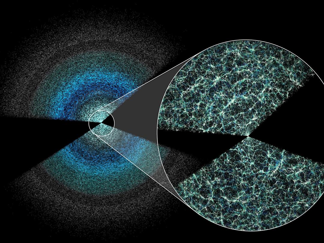 Uma pequena fatia do mapa do levantamento de cinco anos do Desi revela galáxias e quasares acima e abaixo do plano da Via Láctea. A estrutura em grande escala do Universo é visível na ampliação. A Terra está no centro dos setores e a área preta indica onde a nossa Galáxia obscurece objetos distantes. A luz das galáxias mais distantes mostradas tem 11 bilhões de anos quando chega à Terra. Claire Lamman, Colaboração Desi