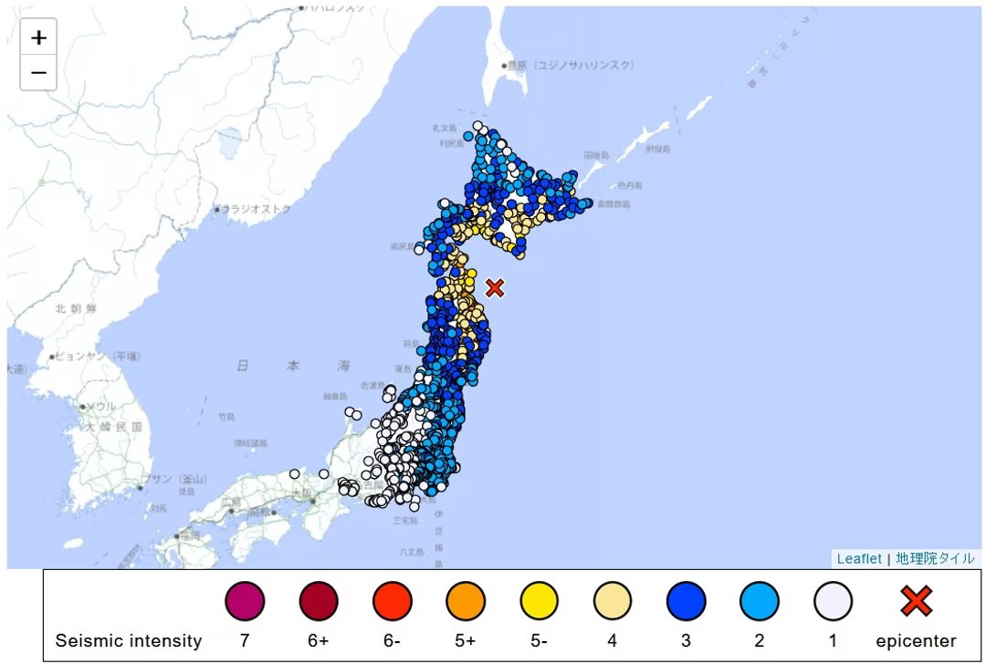 Localização do epicentro do sismo de 8 de dezembro de 2025 e indicação da intensidade dos tremores sentidos pela população. © Agência Meteorológica do Japão