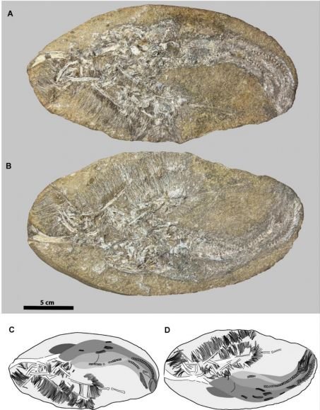 Vista dos dois blocos fósseis com pterossauros e peixes. Abaixo, esboços de suas orientações. Crédito: Relatórios científicos.