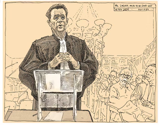 O advogado de Wallerand de Saint-Just, Mᵉ Henri Laquay, no tribunal de Paris, 10 de fevereiro de 2026.