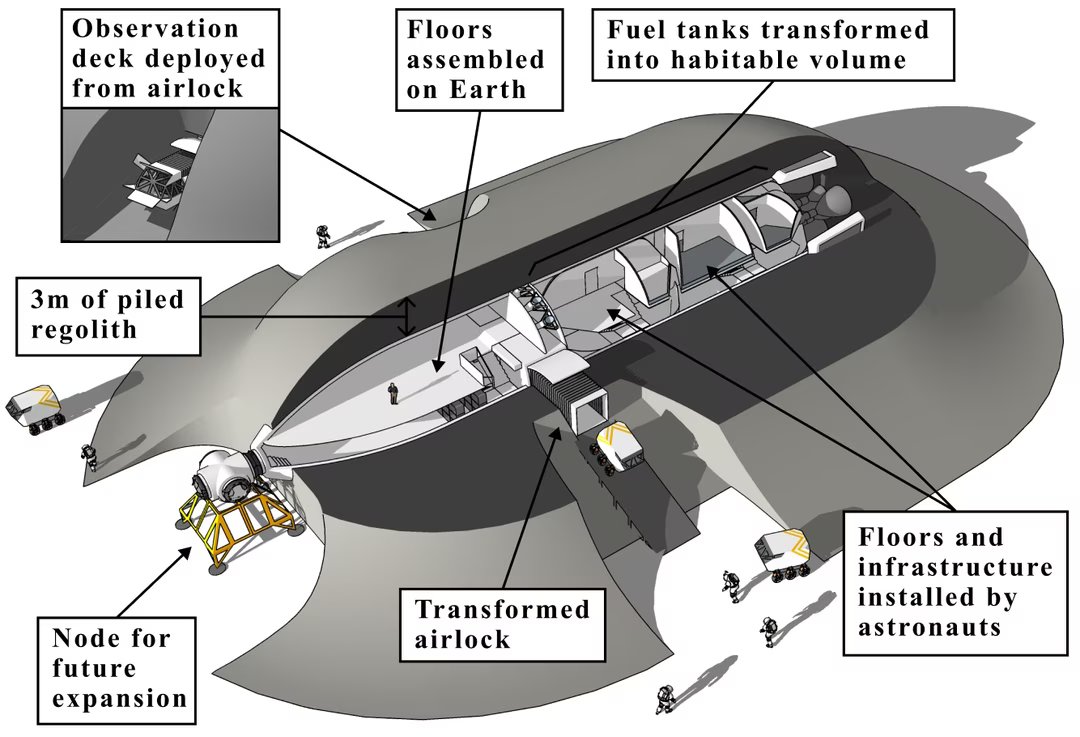 Do lado técnico, a SpaceX já apresentou seu projeto técnico no Congresso Internacional de Astronáutica há muito tempo. Ele propõe transformar uma nave estelar em um habitat permanente. Uma vez colocada na superfície lunar, a nave seria inclinada horizontalmente e coberta com regolito para se proteger da radiação. Os sistemas de suporte à vida estariam conectados a ele. Em última análise, o volume habitável excederia o do Estação Espacial Internacional.