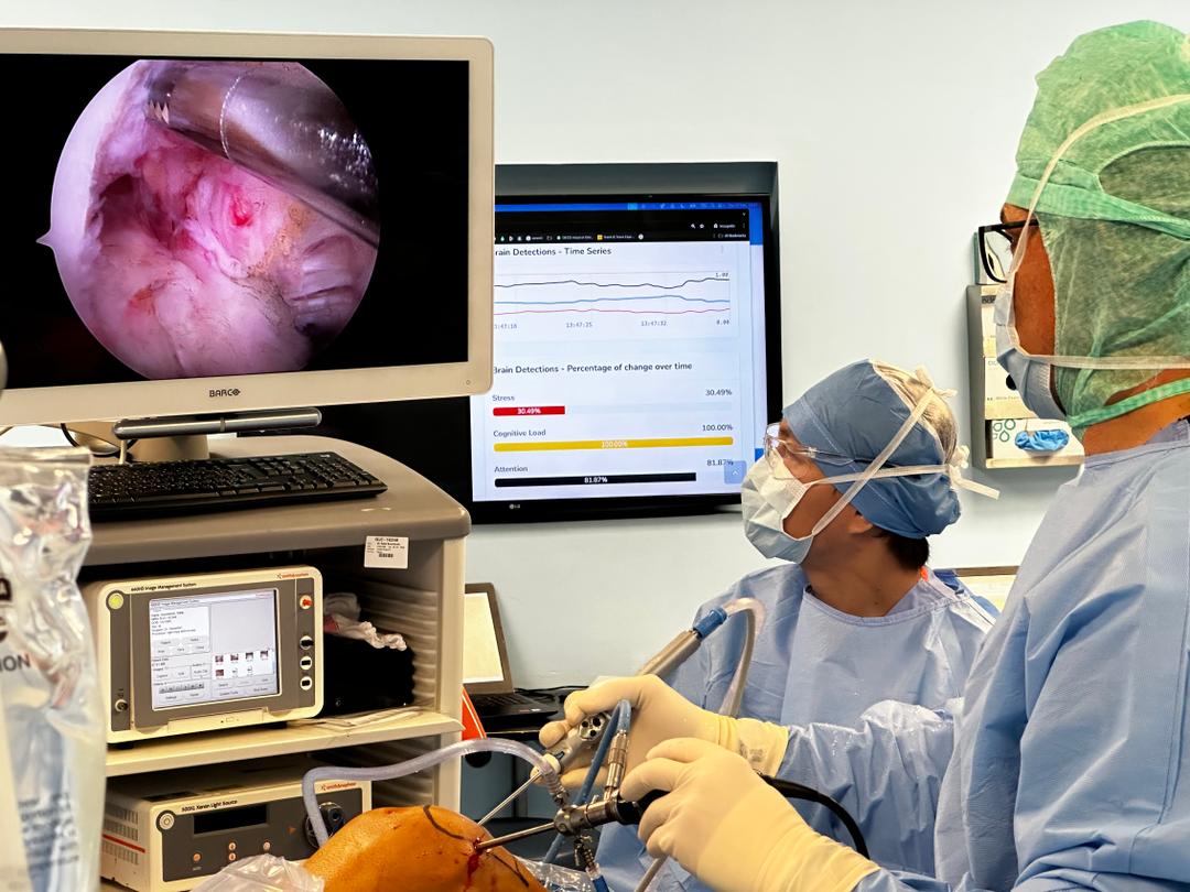 O professor Sébastien Parratte usa a IA multimodal do Inclusive Brains para visualizar níveis de estresse, atenção e carga mental em tempo real durante seus procedimentos cirúrgicos. © Cérebros Inclusivos