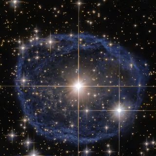 Uma grande bolha azul com uma estrela brilhante no centro contra um fundo preto repleto de estrelas, esta é uma bela imagem do Telescópio Espacial Hubble da NASA/ESA que mostra uma estrela Wolf-Rayet conhecida como WR 31a, localizada a cerca de 30.000 anos-luz da Terra, na constelação de Carina (A Quilha). A distinta bolha azul que parece circundar WR 31a é uma nebulosa Wolf-Rayet, uma nuvem interestelar de poeira, hidrogênio, hélio e outros gases. Criadas quando ventos estelares rápidos interagem com as camadas externas de hidrogênio ejetadas pelas estrelas Wolf-Rayet, essas nebulosas são frequentemente em forma de anel ou esféricas. A bolha, que se formou há cerca de 20 mil anos, está a expandir-se a uma velocidade de cerca de 220 mil quilómetros por hora! Infelizmente, o ciclo de vida de uma estrela Wolf-Rayet é de apenas algumas centenas de milhares de anos, um piscar de olhos em termos cósmicos. Embora as suas vidas tenham começado com uma massa pelo menos 20 vezes a do Sol, as estrelas Wolf-Rayet normalmente perdem metade da sua massa em menos de 100.000 anos. E o WR 31a não foge à regra. Terminará, portanto, a sua vida numa supernova espectacular, e a matéria estelar expelida pela sua explosão alimentará mais tarde uma nova geração de estrelas e planetas. © ESA/Hubble e NASA, Agradecimentos: Judy Schmidt