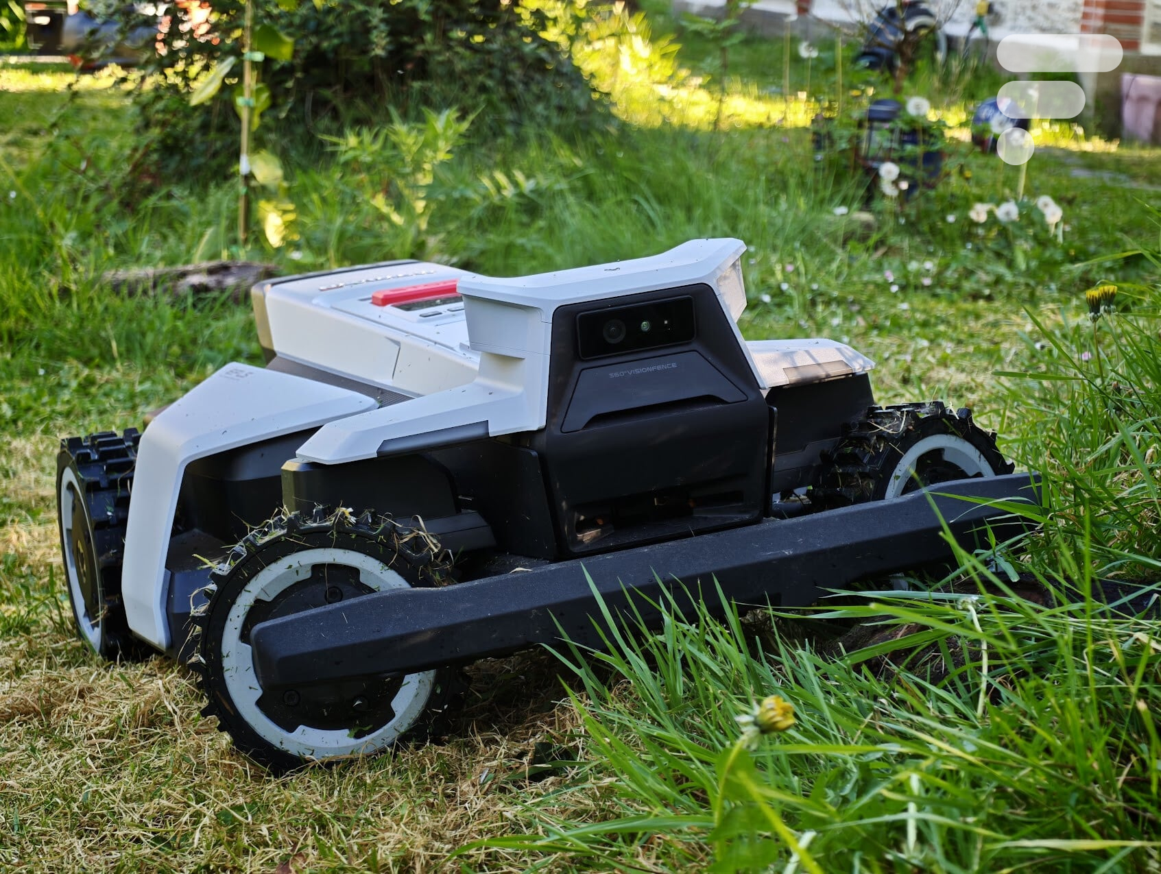 La VisionFence 360° couvre l’ensemble du périmètre du robot avec des caméras avant et latérales. La détection s’effectue jusqu’à 3 m pour les personnes, avec ralentissement progressif à partir de 1 m. Les obstacles classiques, mobilier de jardin, outils, ballons, animaux, sont identifiés et contournés sans à-coup. Par contre, 360°… le robot ne couvre pas l’arrière. Il arrive qu’il recule sur des obstacles en manoeuvrant dans les passages délicats.