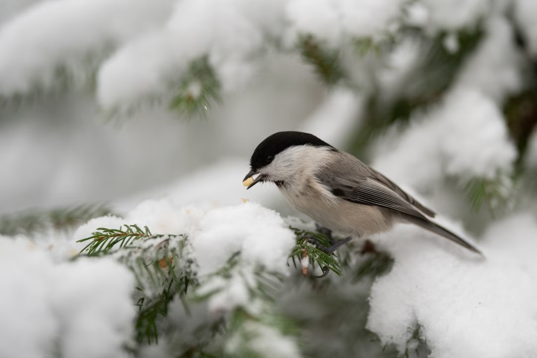Este chapim-craca acaba de encontrar uma semente, seu alimento preferido no inverno. © honey_paws, Adobe Stock