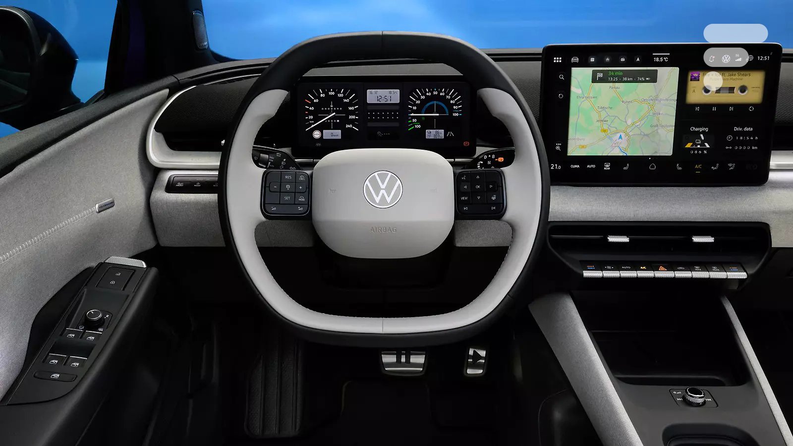 Esta é provavelmente a melhor notícia da semana para muitos: a Volkswagen parou de tentar reinventar a roda quadrada. A ergonomia do ID.Polo marca o retorno ao favorecimento do botões físicos. Não há mais superfícies capacitivas no volante que são ativadas ao virar em uma rotatória. O volante possui botões reais com um clique claro e tranquilizador.